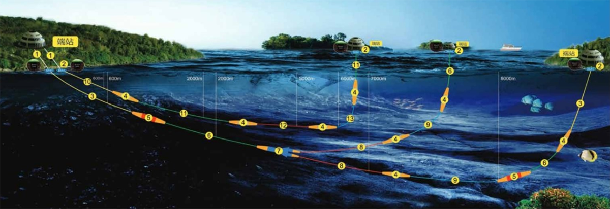 全球95%的國(guó)際數(shù)據(jù)通過(guò)海底光纜傳輸,在跨海洋通信系統(tǒng)中,海纜是系統(tǒng)的樞紐,光信號(hào)通過(guò)基站發(fā)出,經(jīng)由海纜,再經(jīng)由中繼器進(jìn)行信號(hào)放大,再經(jīng)由分支器進(jìn)行信號(hào)的分支,再傳輸至多個(gè)端站接口。跨洋通信系統(tǒng)具有傳輸性能穩(wěn)定,不受電磁波或雷擊干擾,通信容量大,長(zhǎng)距離傳輸?shù)忍攸c(diǎn)。